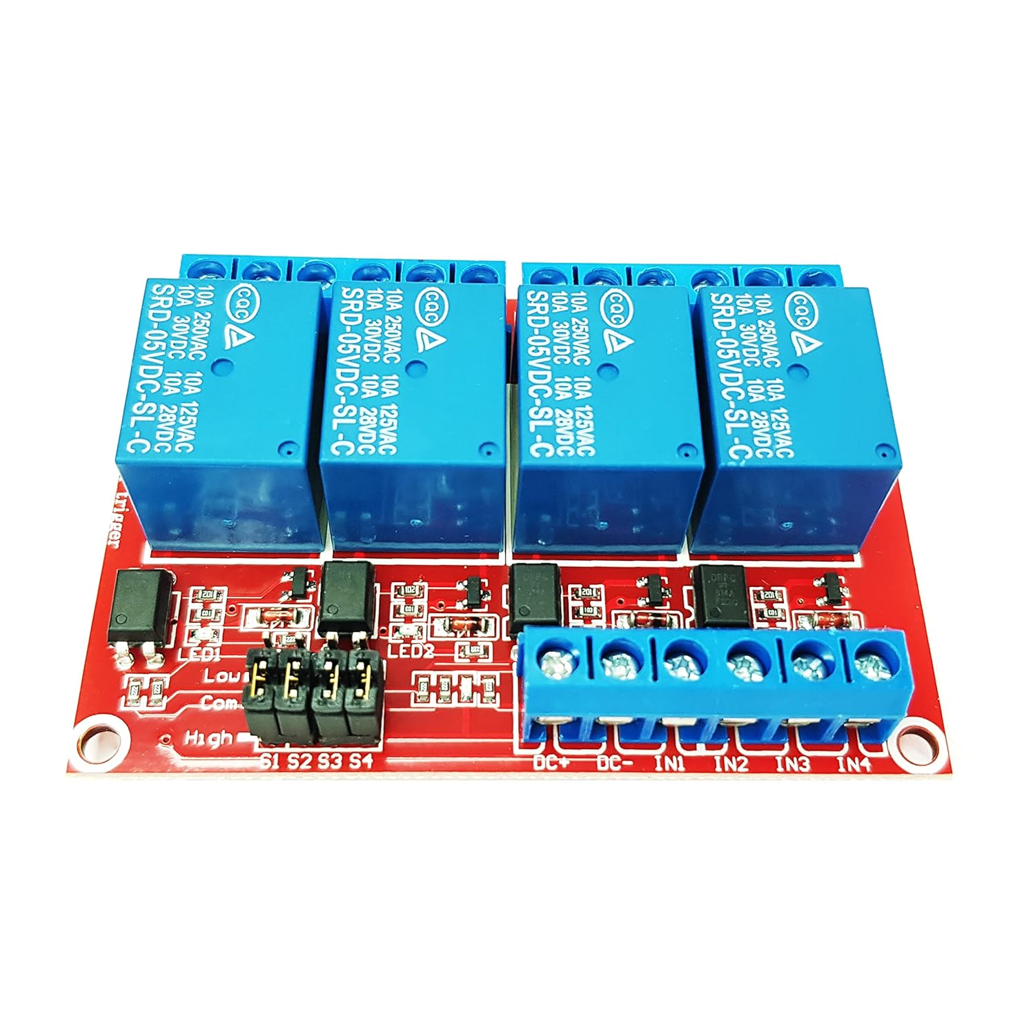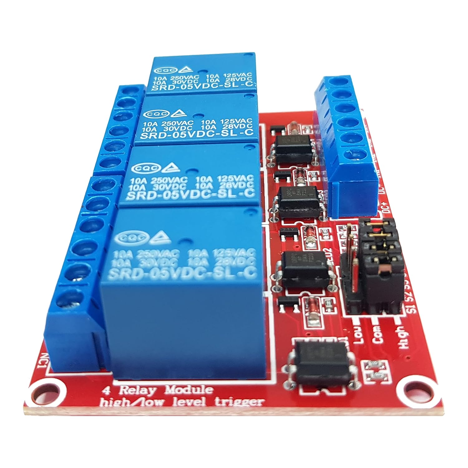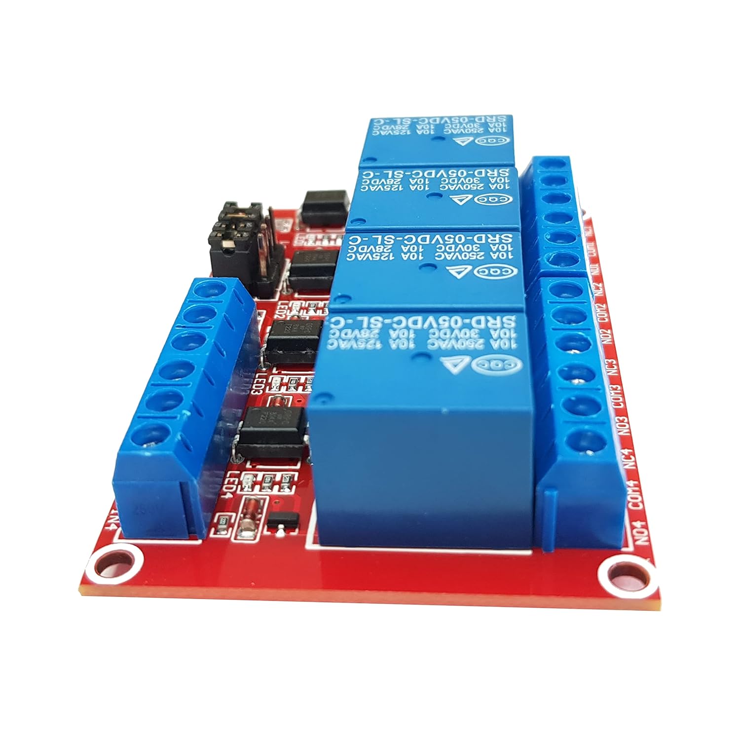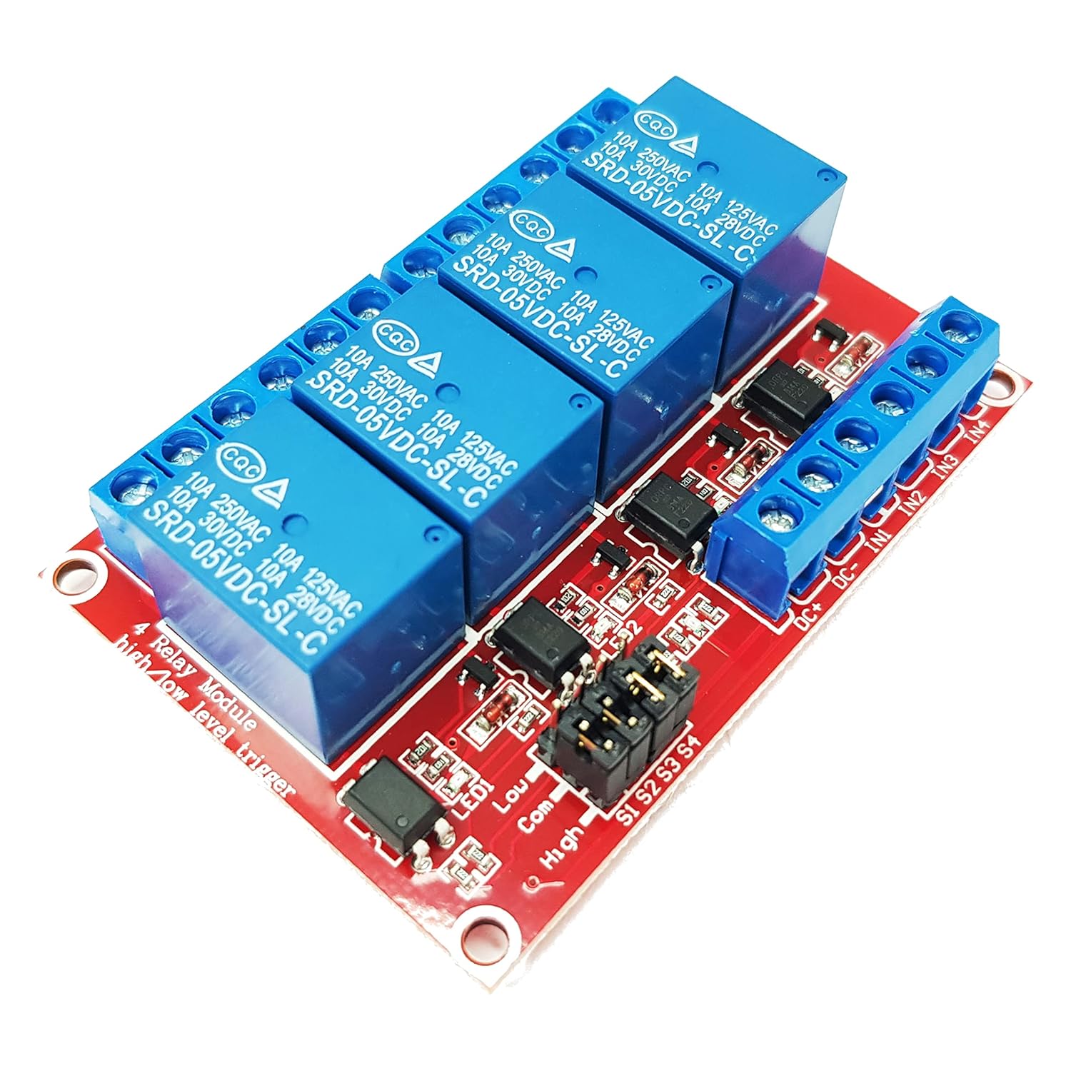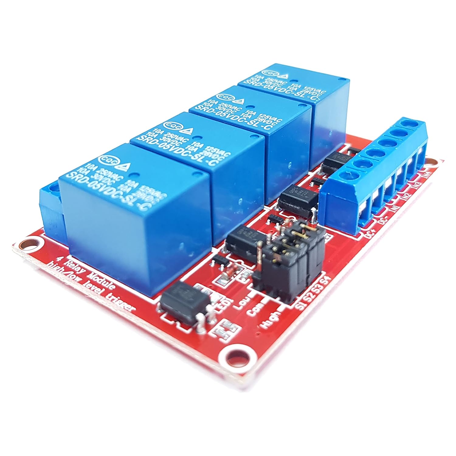 A module includes 4 relays 5V with Terminal Blocks for both Input and Output Interface Each relay supports Normally Open and Normally Closed and Optocoupler Isolation. Each relay supports High-level Trigger or Low-Level Trigger selectable by a jumper. Relay for Arduino, ESP32, ESP8266, Raspberry Pi, or any 5V or 3.3V microcontroller. Tutorials for Arduino is provided.