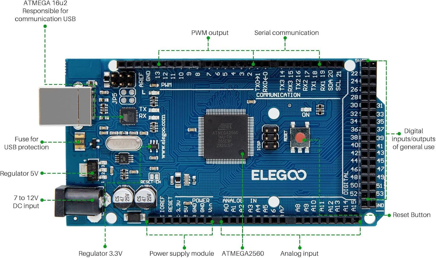 The Mega is 100% compatible with Arduino IDE and most shields designed for the Arduino mega R3,RoHS Compliant The chip is Atmega+2560-16au and 16u2, same with the official version. Improved and expert version: 1. 0 pinout: added SDA and SCL pins that are near to the AREF pin and two other new pins placed near to the RESET pin, the IOREF that allow the shields to adapt to the voltage provided from the board. In future, shields will be compatible both with the board that use the AVR, which operate with 5V and with the Due that operate with 3. 3V. The second one is a not connected pin, that is reserved for future purposes. Stronger RESET circuit. Use 5. 5 * 2. 1mm DC barrel jack (compatible with 5. 5 * 2. 5mm DC barrel jack) It contains everything needed to support the microcontroller; simply connect it to a computer with a USB cable or power it with an AC-to-DC adapter or battery to get started.