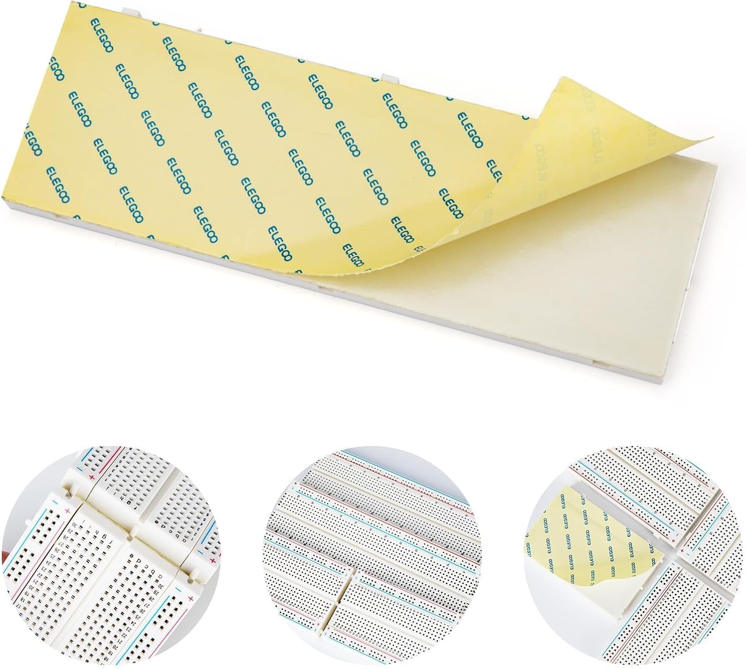 400 point and 830 point breadboard for versatile prototypes and circuit experiments and other DIY projects. Four power rails and color legend on distribution strips for efficient circuit building. Self-adhesive tape on the back for easy attachment to the Prototype Shield. Made with high-quality white PP plastic body and black printed legend. Conveniently packed in a paper box for safe storage and transportation.