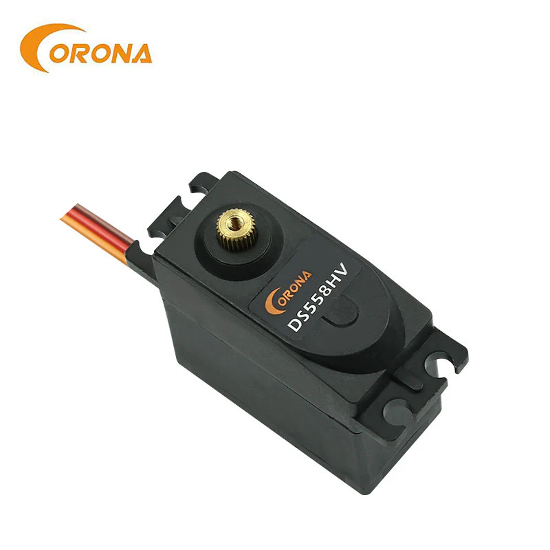 Corona DS558HV Digital Metal Gear Servo 14kg / 0.18 Sec / 58g Specs: Model: DS558MG Operating Voltage: 6.0V / 7.4V Operating Current: 300mA / 400mA Operating Speed: 0.20sec.60°/ 0.18sec.60° Stall Torque: 12kg.cm / 14kg.cm Size: 20X40X38.5mm Weight: 58g Dead Band: ≤3uSec Operating Travel: 40°/one side pulse traveling 400us Potentiometer: 5 slider/Direct Drive Ball bearing: MR106 Gear Material: Metal Gear Type: Digital Motor: Brushed Connector wire: 300mm Operating Temperature Range: -20°C+60°C Spline count: 25