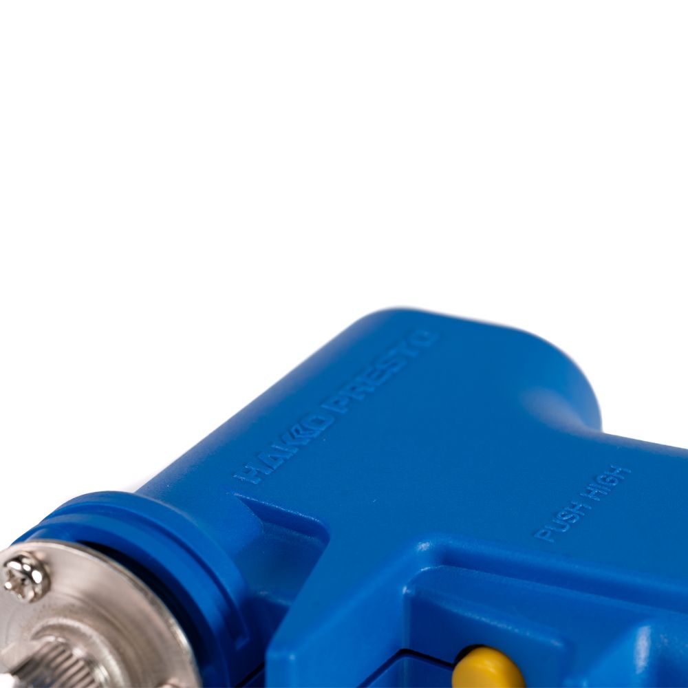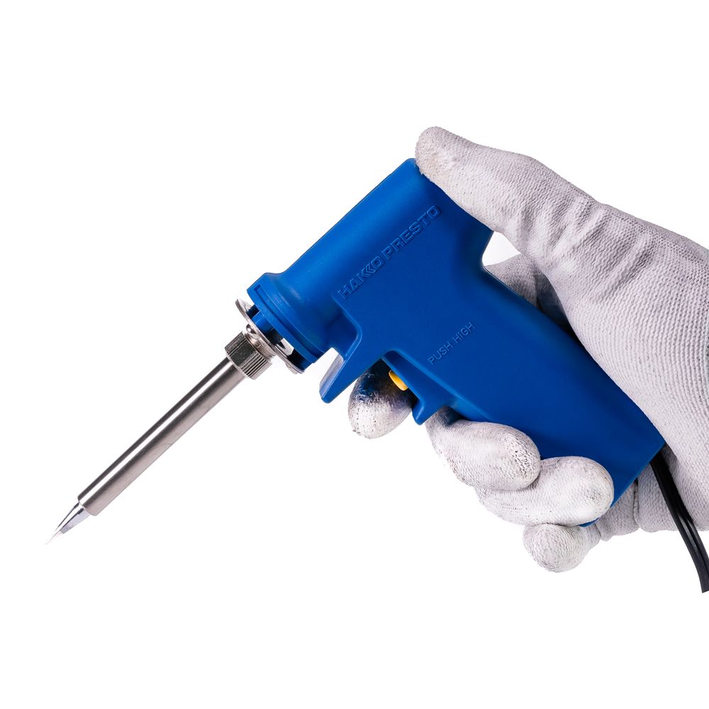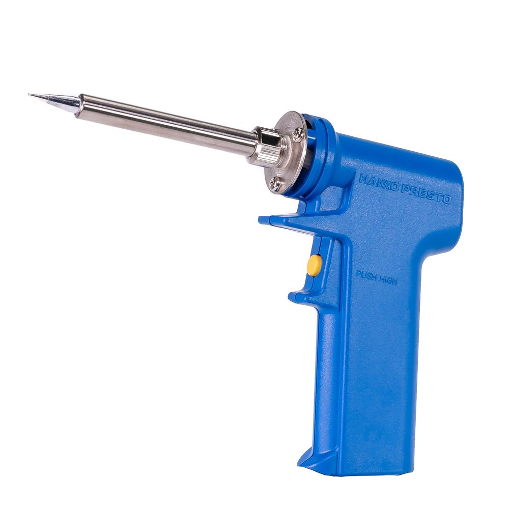 Pistol style Hakko Presto iron is a 20W light-duty iron with a boost feature allowing the user to increase power to 130W for occasional heavy-duty applications.