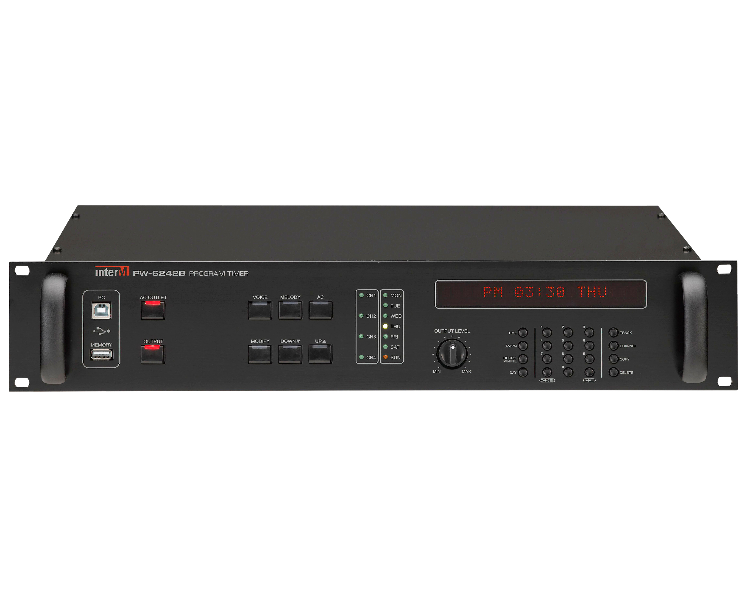 Product Features ■ Considering user convenience For the convenience of timer program input and use, we made it for user to operate easily by separating digit button & multi-function button. ■ Adopting Large Vacuum Fluorescent Display By adopting large Vacuum Fluorescent Display, you can verify the operation status to each function as well as various text displays at a look. ■ Programing using PC You can easily schedule via management program by connecting PC with RS-232C port. ■ Various melodies and voices output You can play various melodies and voices by interlocking SD Card mounted to this device and PV-6232A, our model. ■ HOSTING Using USB Terminal You can download MP3 file from computer to SD Card mounted to the device by connecting USB cable or mount USB memory to save the file into internal memory through COPY function. You can save 9999 melodies additionally other than 15 melodies provided initially and for storage capacity, please leave 10% of SD Card capacity (up to 32GB supported). ■ BACK-UP Power Under the setting of current time, even though AC power turns off, power can be maintained for about a week of time with internal Back-Up power. Within the time which Back-Up power is maintained, even though AC power is re-authorized, there is no need to re-adjust the time. ■ Blackout Measurement Separate Memory is used to prevent the data loss from blackout or other instable power. ■ Automatic Return When entering schedule data not using PC but using the front button, if any button is pushed for 1 minute, it is regarded as input cancellation and it returns to normal operation status. ■ AC Power Output Control After connecting other equipment with AC OUTLET terminal, by turning ON/OFF AC OUTLET button in front, it enables to control ON/OFF of AC Power connected to other equipment. ■ AC Power Output Time Control In order to prevent TIMING DELAY when interlocking with external POWER AMP, you can adjust AC Power Output Time of this device from 1 second up to 20 seconds. ■ KEY LOCK Schedule and user setting can be protected.