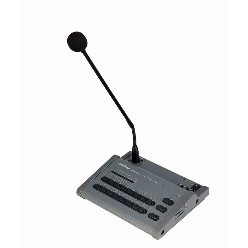 The document provides specifications for the RM-916 remote amplifier with zone selector including its electrical specifications, general specifications, zone control circuits, announcements by microphone capabilities, pre-announcement chime feature, auxiliary input for increased versatility, LED output level indication, and block diagram. It can output to 16 speaker channels individually or all at once and includes a microphone input, auxiliary input, and pre-announcement chime.