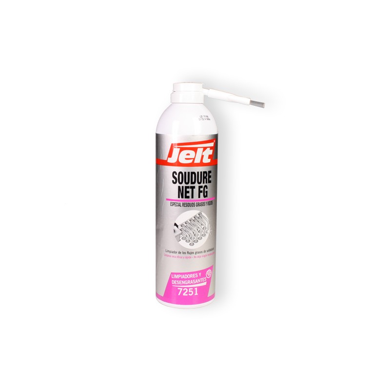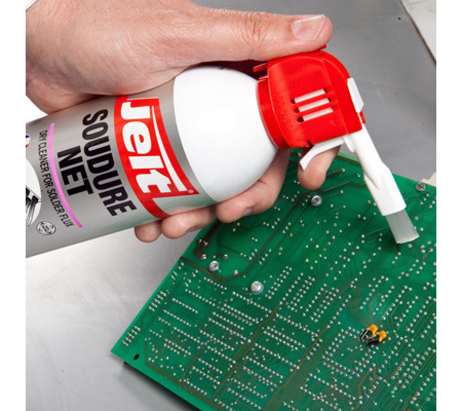 Jelt SOUDURE NET FG is a solder flux remover developed for rapid cleaning and complete removal of greasy flux. Using the brush adds mechanical action to the chemical action, cleaning the circuit efficiently. Product description Dry solder flux cleaner. Especially for greasy and old fluids in manual applications. Characteristics Dual chemical and mechanical action. Anti-static brush with specially designed semi-flexible bristles. It leaves absolutely no white marks. No danger to plastic materials. Total effectiveness on any flow – R, RMA, No Clean. SPECIAL FOR GREASE AND OLD FLUIDS IN MANUAL APPLICATIONS