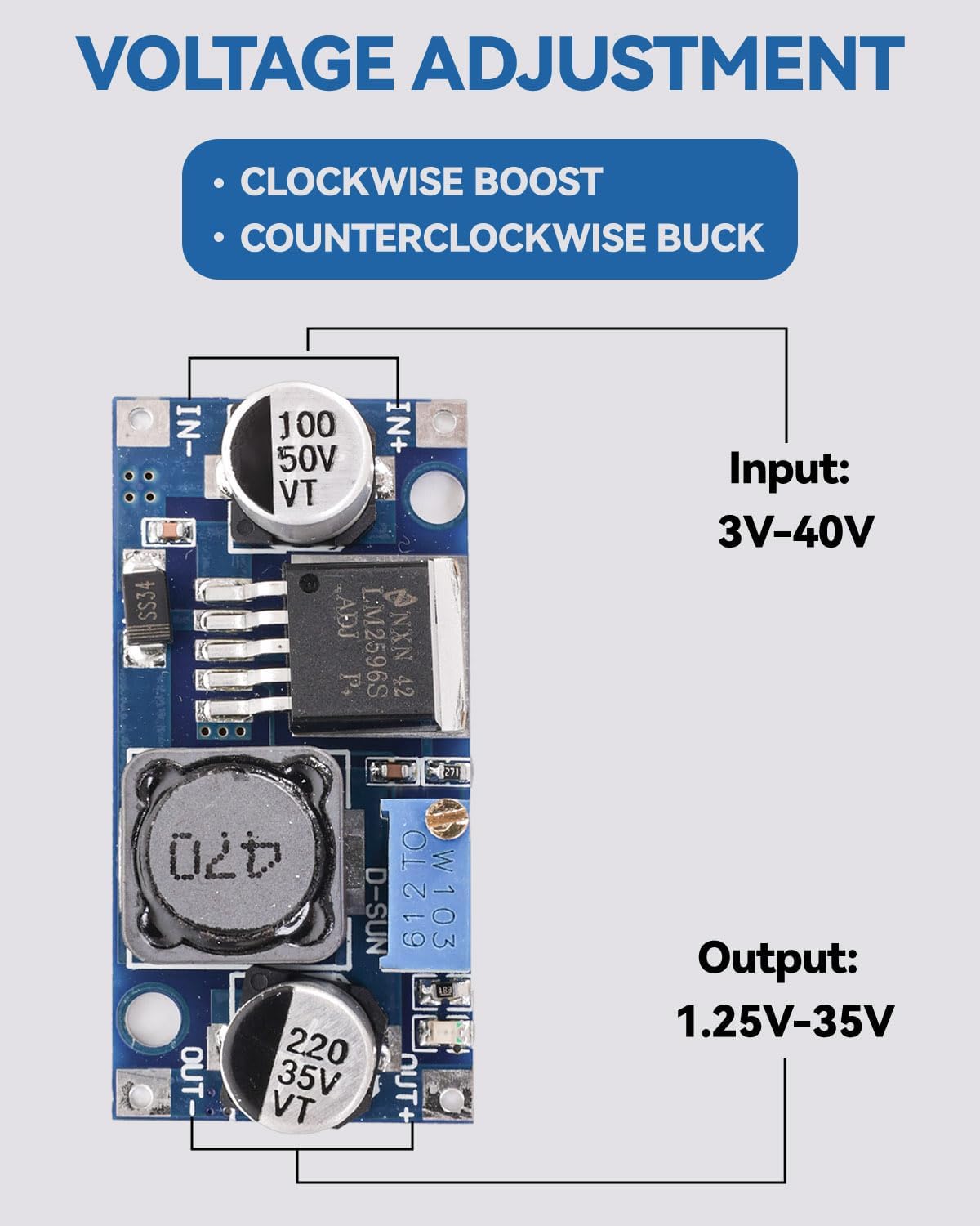 Features: Built with SANYO solid capacitors, 36μ thick PCB, high-Q inductors, and an LED output indicator for enhanced performance and reliability. Application: Perfect for DIY power bank projects, powering monitors, communication devices, and a wide range of other electronic equipment. Wide Input Voltage Range: The LM2596 buck converter supports a broad input voltage range from 3V to 40V, making it ideal for various applications, including DIY electronics, solar power systems, and more.(Input voltage must be at least 1.5V higher than the output voltage; no boost function) High-Efficiency Output: Achieve up to 92% conversion efficiency with this step-down regulator, ensuring stable and efficient voltage regulation for your devices, from 1.25V to 35V. Adjustable Voltage Regulator: Easily customize the output voltage with a precision multi-turn potentiometer, providing flexibility for powering a wide range of electronic projects and devices. Integrated Thermal Protection: Built-in thermal shutdown and current limit protection safeguard your devices from overheating and overload, extending the lifespan of your components. Space-Saving & Robust Build: The LM2596 dc to dc buck converter boasts a compact and sturdy PCB design, allowing seamless integration into small spaces in your projects while maintaining reliable performance.