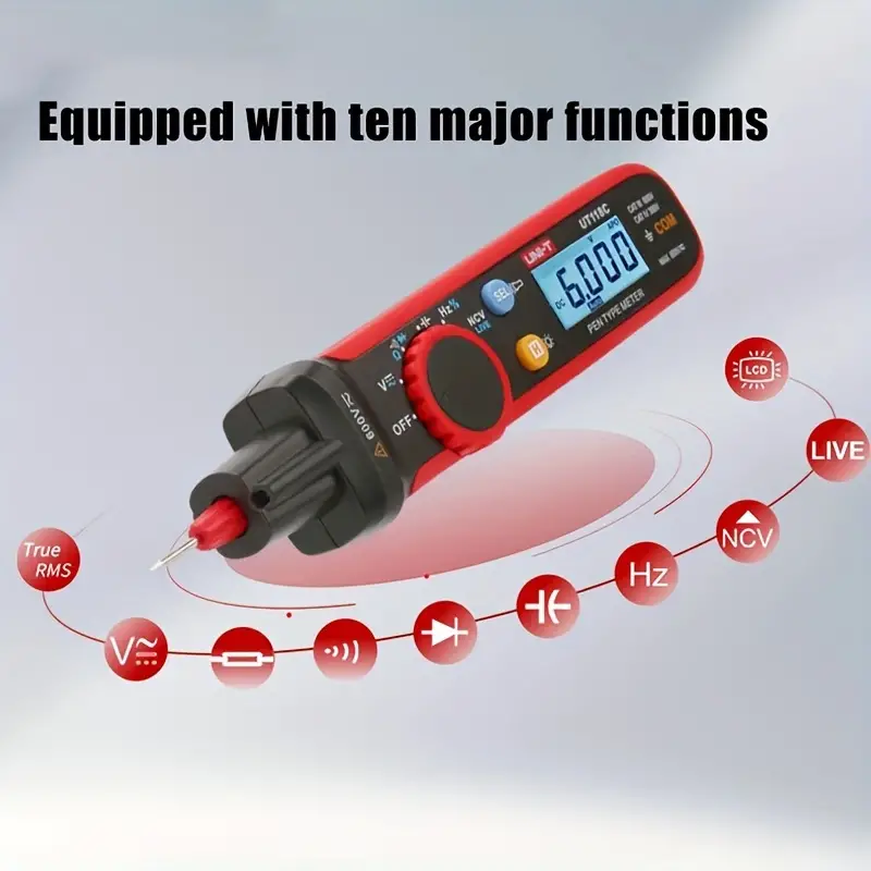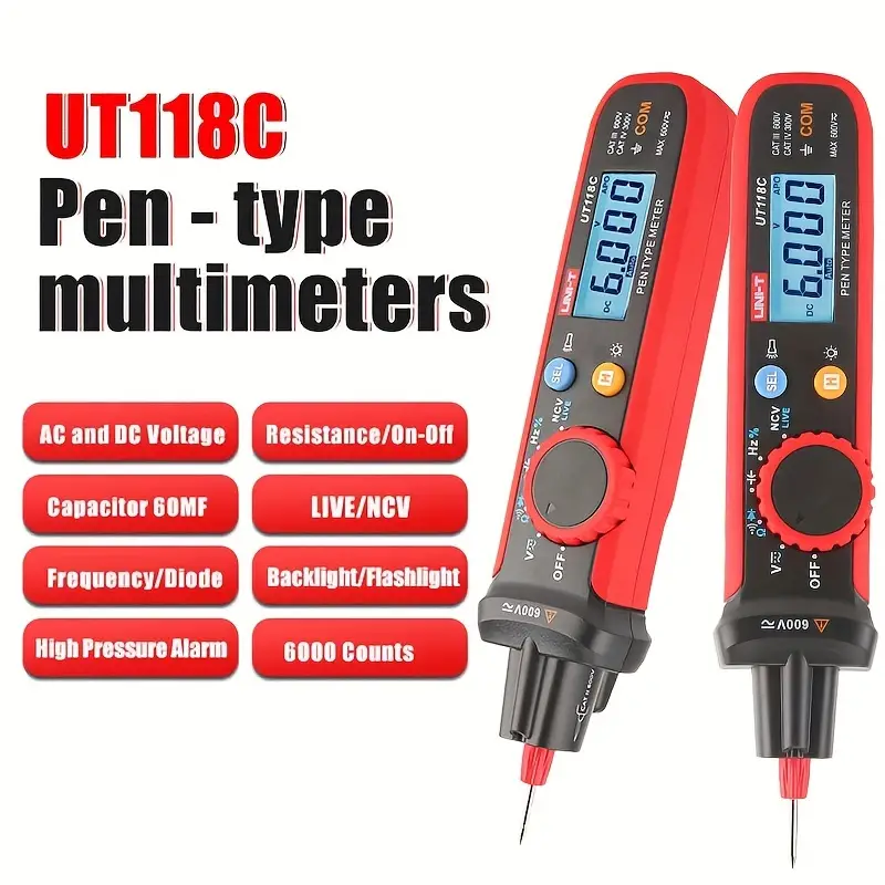 Portable and User-Friendly:Pen Type Electric Tester with a lightweight design and easy-to-use interface. Intuitive Operation:Features auto range, data retention, and automatic shutdown for convenience. Portable and User-Friendly:Pen Type Electric Tester with a lightweight design and easy-to-use interface. Intuitive Operation:Features auto range, data retention, and automatic shutdown for convenience. Practical Design:Flashlight, LCD backlight, and On/Off test make testing in dim or narrow areas simple. User-Friendly Design:Includes a flashlight and LCD backlight for easy use in dim or narrow environments. Practical Design:Flashlight, LCD backlight, and On/Off test make testing in dim or narrow areas simple. User-Friendly Design:Includes a flashlight and LCD backlight for easy use in dim or narrow environments. Uni Type|Unit Digital Multimeter|High Voltage Safety:Safety Level CAT III 600V/CAT IV 300V, ensuring safe operation in high voltage environments. 60.00|Lini T|High Resolution Display:Features a 6000-count LCD for precise measurements, ensuring accurate readings. Uni Type|Unit Digital Multimeter|High Voltage Safety:Safety Level CAT III 600V/CAT IV 300V, ensuring safe operation in high voltage environments. 60.00|Lini T|High Resolution Display:Features a 6000-count LCD for precise measurements, ensuring accurate readings. Comprehensive Measurement:Measuring Resistance Range 600.0Ω to 6.000MΩ, perfect for diverse resistance tests. Comprehensive Measurement Capabilities:Measures AC/DC voltage, resistance, capacitance, frequency, and diode, making it a versatile tool. Comprehensive Measurement:Measuring Resistance Range 600.0Ω to 6.000MΩ, perfect for diverse resistance tests. Comprehensive Measurement Capabilities:Measures AC/DC voltage, resistance, capacitance, frequency, and diode, making it a versatile tool. Advanced Features:Auto Range, NCV, LIVE, and Data Retention for efficient and reliable testing. Safety Features:Equipped with CAT III 600V/CAT IV 300V safety levels, suitable for high voltage tests. Advanced Features:Auto Range, NCV, LIVE, and Data Retention for efficient and reliable testing. Safety Features:Equipped with CAT III 600V/CAT IV 300V safety levels, suitable for high voltage tests.