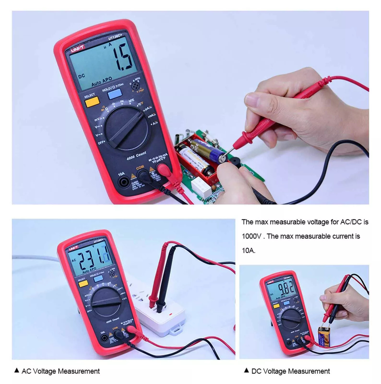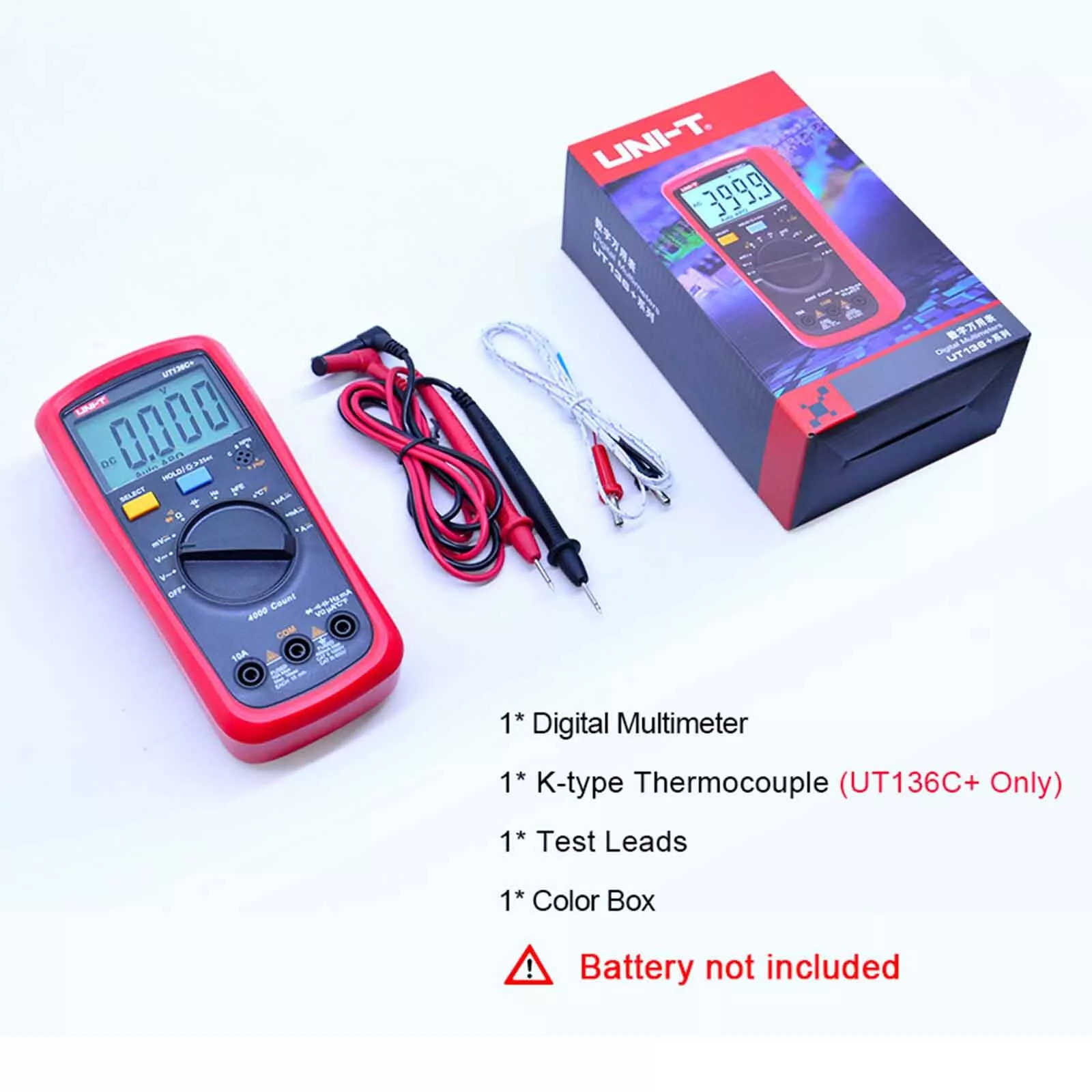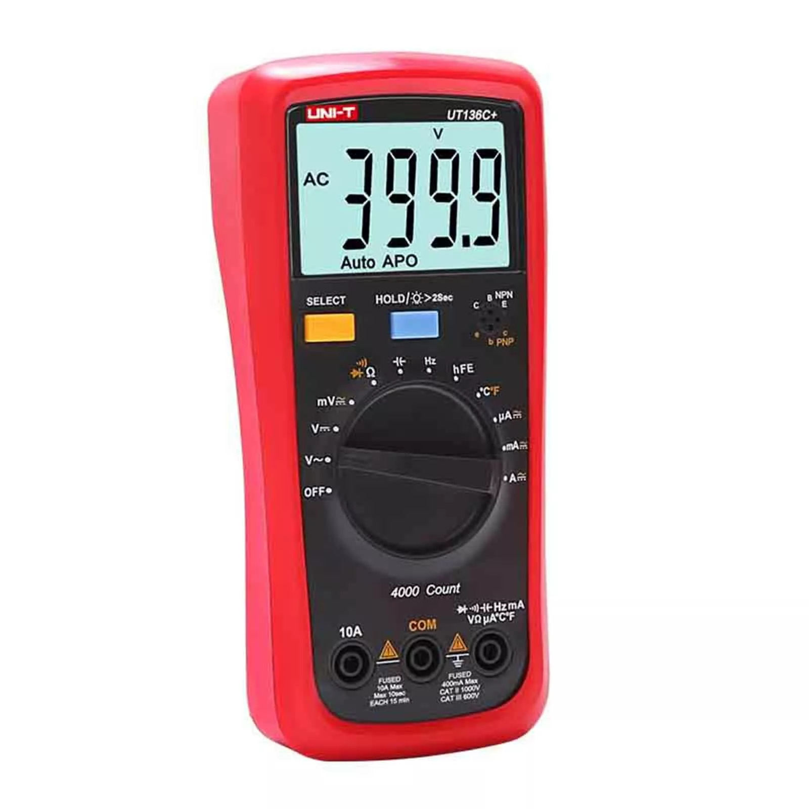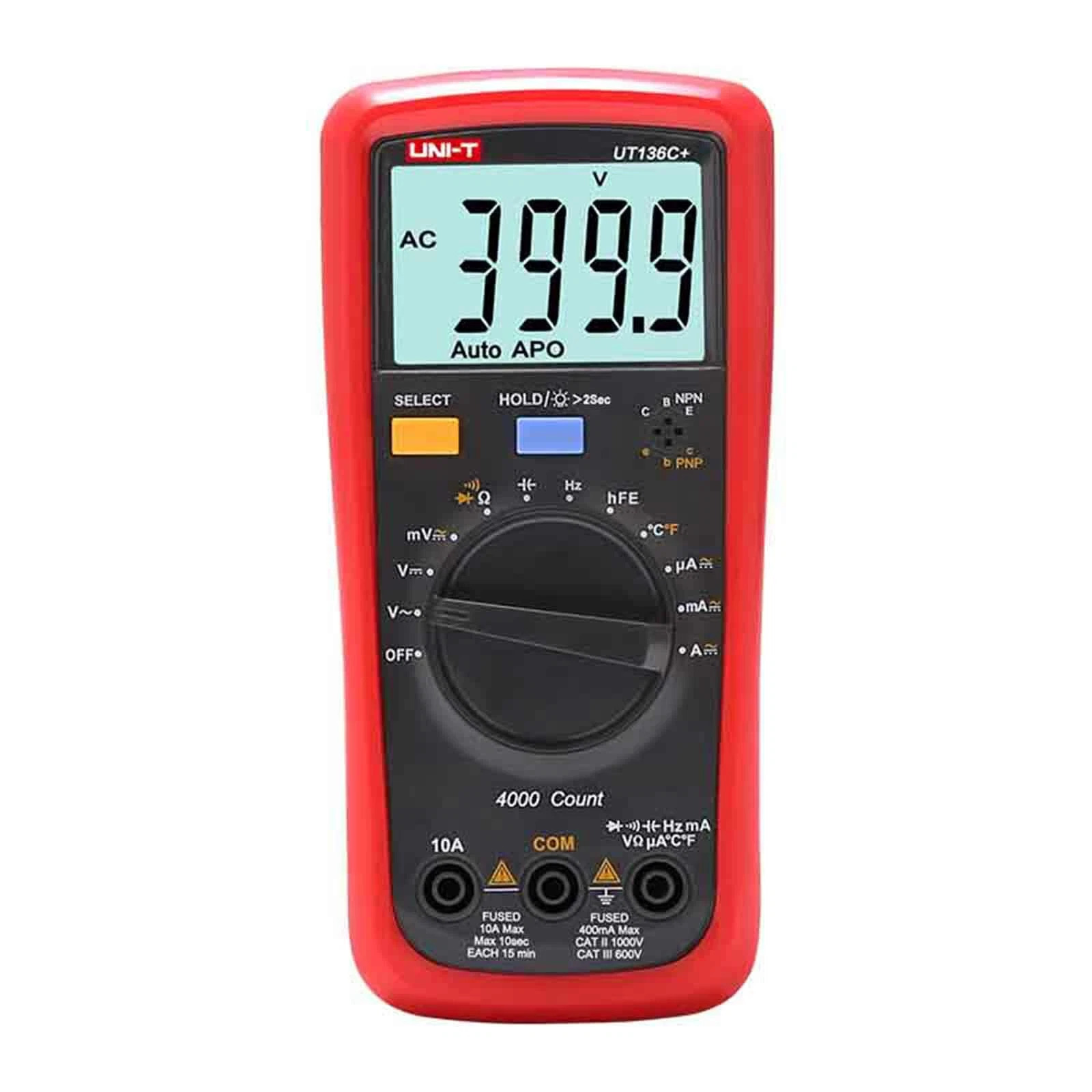 The new generation of UT136+ series digital multimeter has an innovative industrial design which ensures that the product can withstand a drop of 2 meters height. Large LCD screen provides a clear display and its 4 times/second sampling rate provides users with more accurate readings. UT136+ series is designed to work safely in CAT II1000V/CAT III 600V environment. 1. Measures up to 1000V and 10A AC/DC voltage and current 2. Equipped with 3mm protective sleeve; 2 meters drop proof 3. Large LCD display; Overload alarm 4. Quick sampling rate, up to 4 times/s 5. Quick capacitor measurement (measures 1mF in 4 seconds) 6. Low power consumption and auto power saving function; long battery service life (>500hrs)