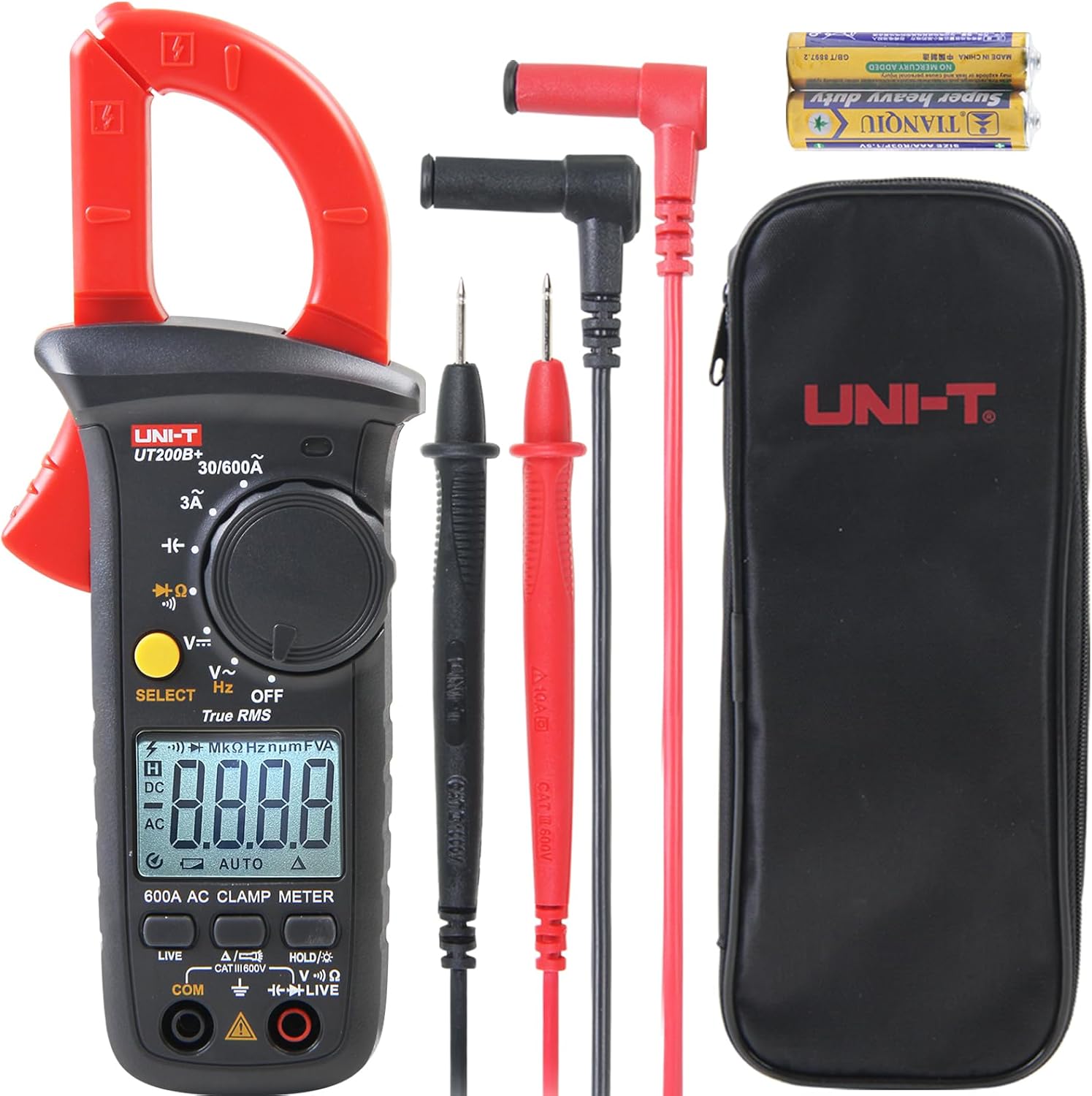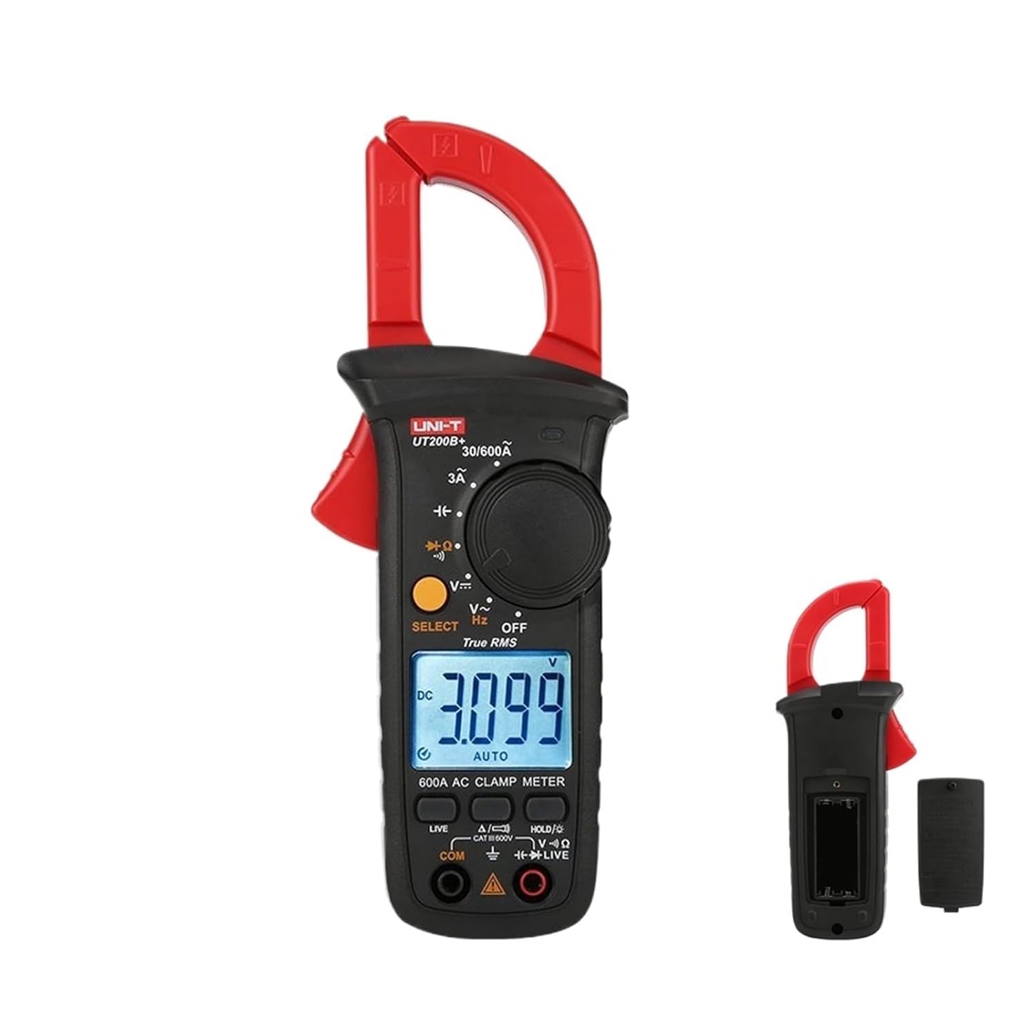 True RMS clamp meter: This current clamp can accurately measure 600A AC current, 600V AC/DC voltage, resistance, capacity and also provides diodes, continuity, relative value measurement and high voltage frequency measurement. LIVE features with acoustic and optical warnings. Easy to use for laboratories, factories and households. Multifunctional: Digital LCD display with backlight - LED torch, relative value, low battery indicator, data storage, true RMS, automatic range, SEL function, automatic shut-off after 15 minutes of inactivity, 2 x 1.5 V AAA batteries already included. Safety and overload protection: equipped with acoustic and visual alarm signals in case of overvoltage and overcurrent. Full-featured false detection protection, up to 600 V surge shock, can meet the reliability and safety operation requirements. Is a cost-effective digital clamp meter for electrical and electronic testing. Clamp measurement: the clamping jaws measure AC current up to 28 mm without interrupting the circuit, making it safer to use on main cables and high-current loads in vehicles. Only one current conductor can be measured at a time, the conductor to be measured must be placed in the middle of the pliers head Easy to read: The pliers multimeter has a backlit screen and an LED torch, so you can display the readings in low or low light. For example, in electrical cabinets, under buildings, behind appliances and in other enclosed spaces. The LED torch illuminates weak measuring ranges and is very practical.