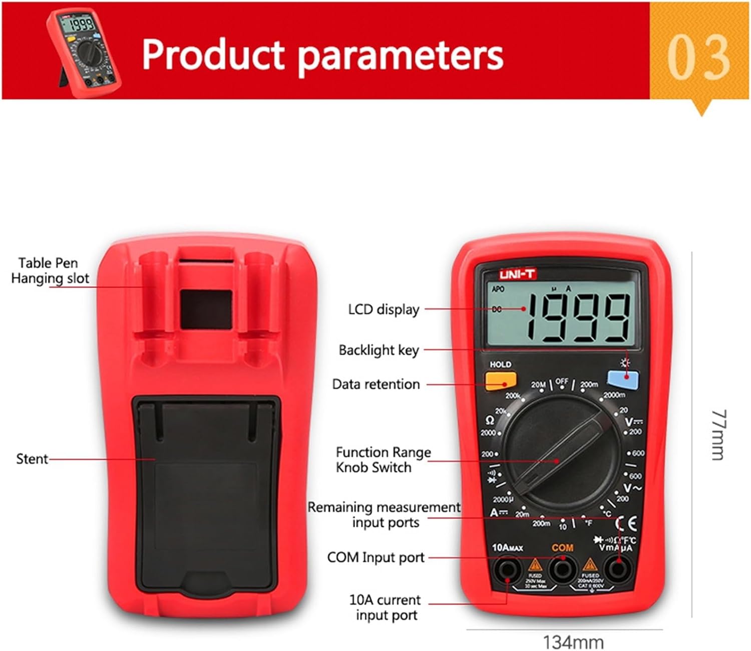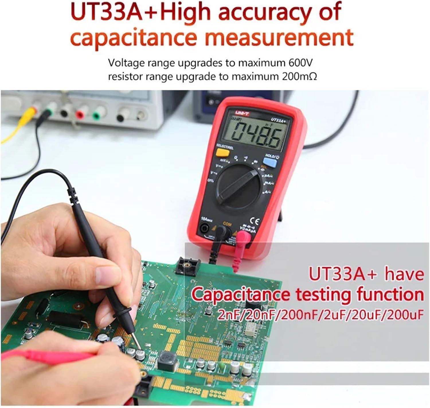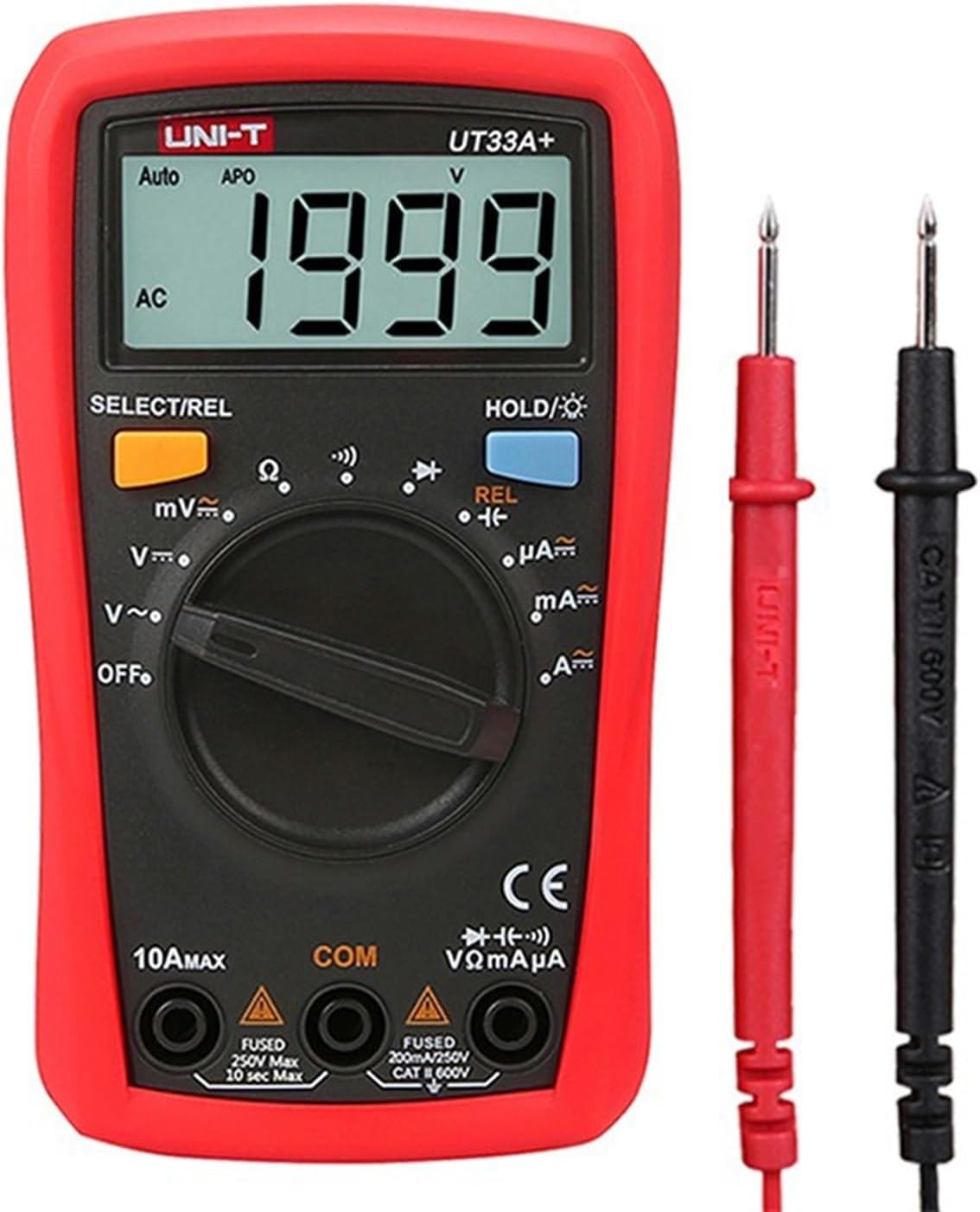 The generation UT33+ series redefines the performance standards for entry-level digital multimeters. Our innovative industrial design ensures that these products can withstand 2 meters drop. The LCD display layout provides a better user experience. This series ensures that users can work safely in II 600V environment. Special features are, 2mF capacitance test (UT33A+); battery test (UT33B+); temperature measurement function (UT33C+); non-contact voltage (NCV) test (UT33D+).