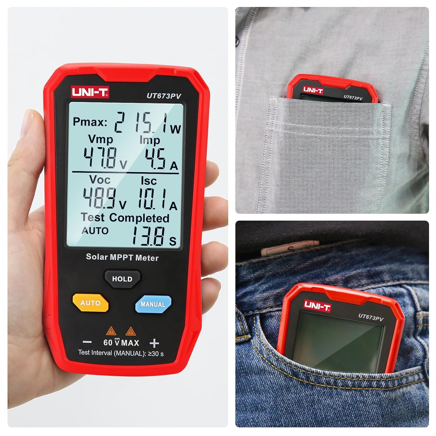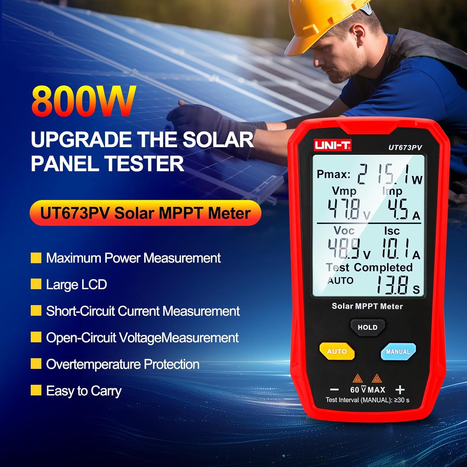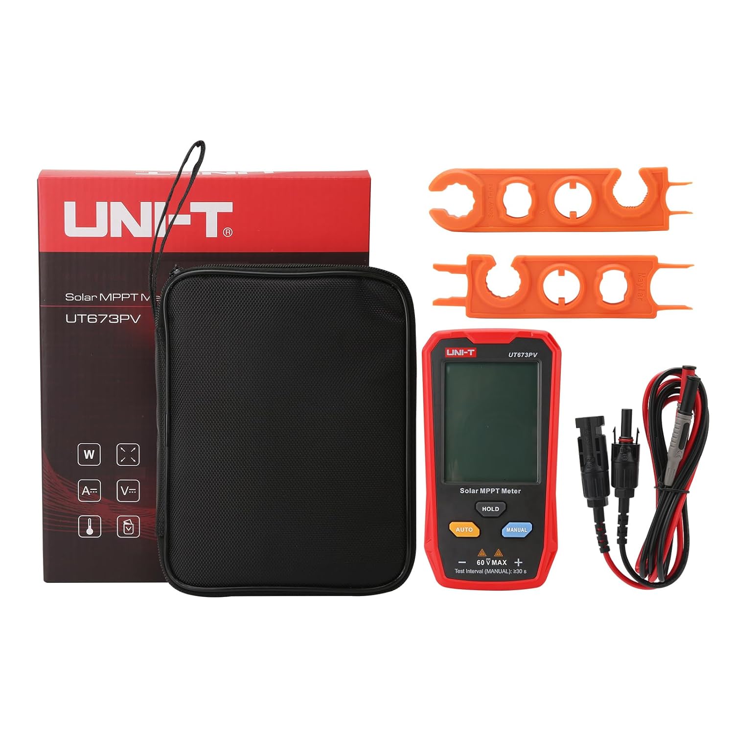 UT673PV solar MPPT meter can effectively identify any abnormalities in solar panels by testing their maximum power, peak power voltage, peak power current, open circuit voltage, and short circuit current. Range: Maximum power test (Pmax) 5~800W, Peak power voltage (Vmp) 12~60V, Peak power current (Imp) 0~35A, Open circuit voltage (Voc) 12~60V, Short circuit current (Isc) 0~35A Featuring a spacious screen and automatic measurement capabilities, this device conveniently displays all measurement results simultaneously. Free switching of multiple languages ( EN, FR, DE, IT, ES, SV, PL, CZ ) Large screen and multiple result display. No batteries needed, powered by the solar panel. Equipped with MC4 test lead. Its portable design enables easy carrying, greatly enhancing the operational and maintenance efficiency for photovoltaic manufacturers, installers, and end users Safe & Durable: Safety Class CAT 0 60V. What you get: 1 x UT673PV Solar MPPT Meter, 1 x paper Manual, 1 x Cloth Bag, 1 x MC4 wrench Tool, 1 x MC4 test lead