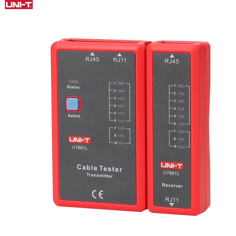 The UNI-T UT681L cable tester is an easy-to-use device for testing RJ11 and RJ45 cables, also known as telephone and Ethernet cables. The cables can be tested for open, short, and crossover circuits. The device consists of two modules, one acting as a transmitter and one as a receiver, meaning you can test a signal over an entire cable. These two modules are separable, you can connect each separate part at the end of the cable, meaning you can test a cable even when the cable is installed inside a wall.
